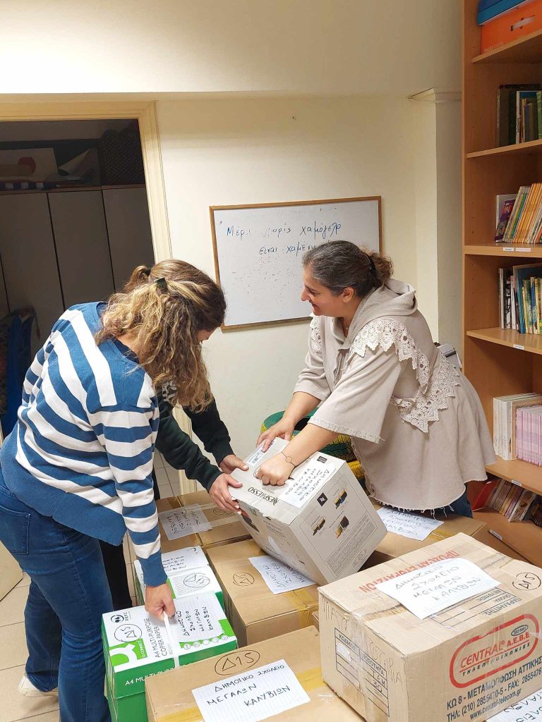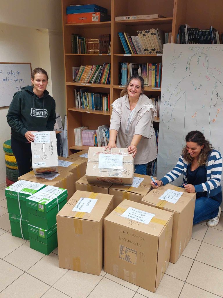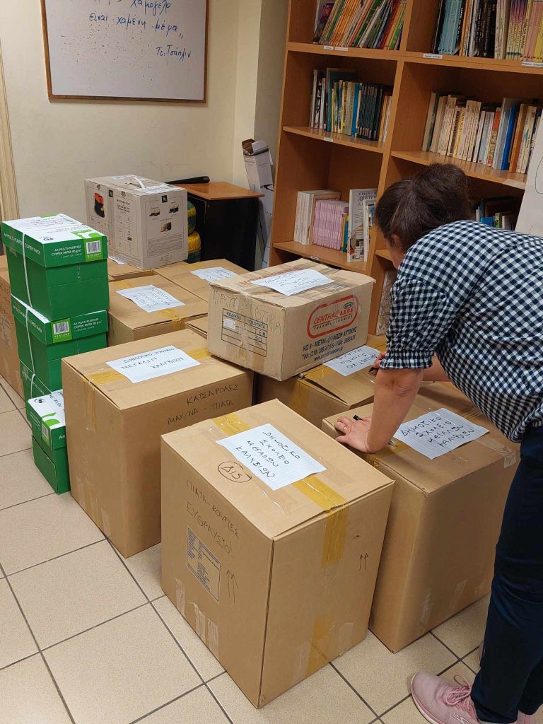 Οι γονείς του σχολείου μας αγκάλιασαν τη δράση και έτσι συγκεντρώσαμε 15 κούτες με είδη για τις ανάγκες του σχολείου, όπως χαρτί φωτοτυπικό, διάφορα χαρτόνια κατασκευών κανσόν, γκοφρέ, βελουτέ, σετ τέμπερες, κασετίνες και τετράδια. Επίσης, συγκεντρώσαμε είδη πρώτης ανάγκης για τις οικογένειες των μαθητών, πιάτα, ποτήρια, κατσαρόλες, τηγάνια, μαχαιροπήρουνα, πετσέτες μπάνιου, πετσέτες κουζίνας, τραπεζομάντηλα.