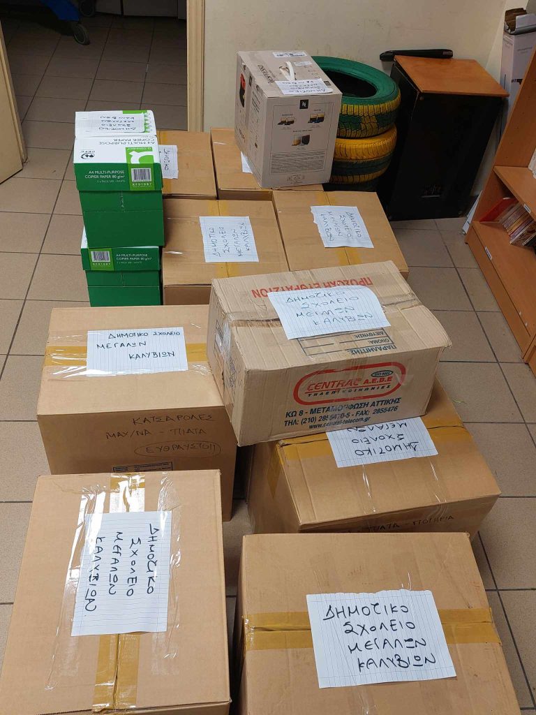 Τα κουτιά έφτασαν στο Δημοτικό Σχολείο Μεγάλων Καλυβίων με τη συνδρομή της Σοφίας Δανιηλίδου, γονέα του σχολείου μας, η υποστήριξη της οποίας ήταν πολύ σημαντική και την ευχαριστούμε!