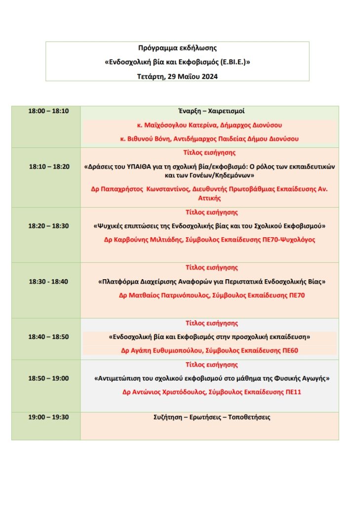 Ενημερωτική εκδήλωση με θέμα «Ενδοσχολική βία και Εκφοβισμός (Ε.ΒΙ.Ε.)» διοργανώνεται από τη Διεύθυνση Πρωτοβάθμιας Εκπαίδευσης (ΔΠΕ) Ανατ. Αττικής και το 5ο ΠΕ.Κ.Ε.Σ. Αττικής, σε συνεργασία με τον Δήμο Διονύσου.